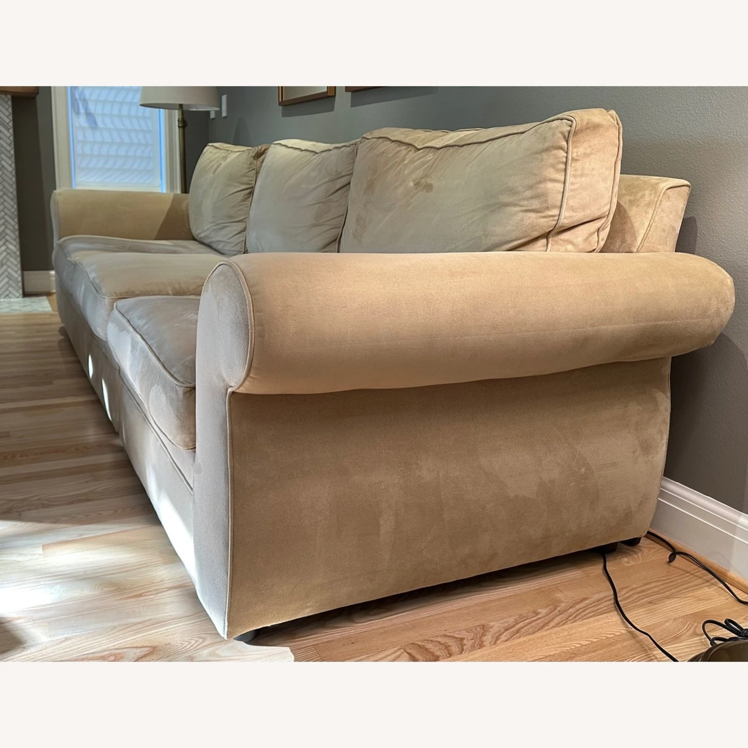 Seller’s Notes: Pottery Barn rolled-arm natural micro-suede. No kids, no pets, no stains, no smell, little use.