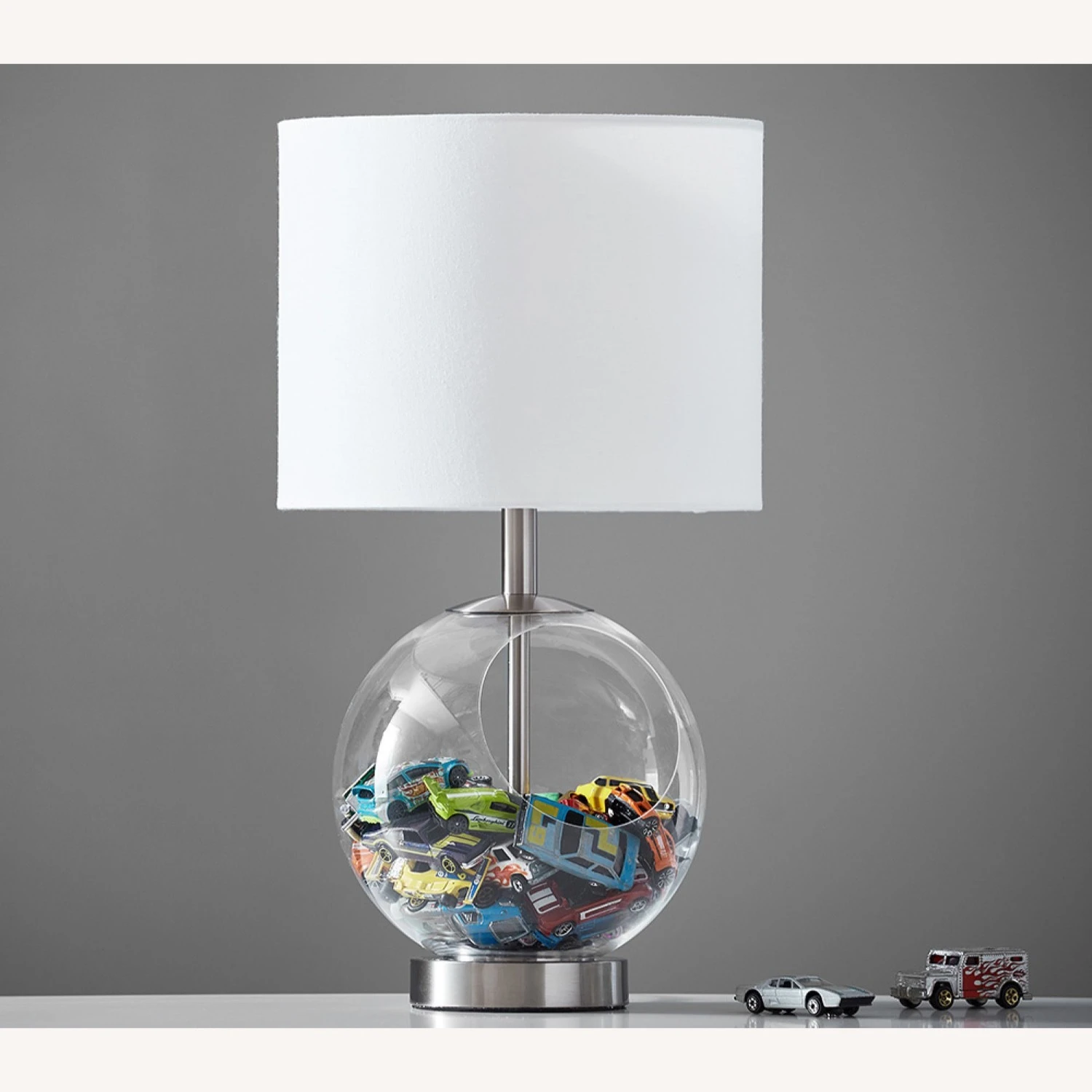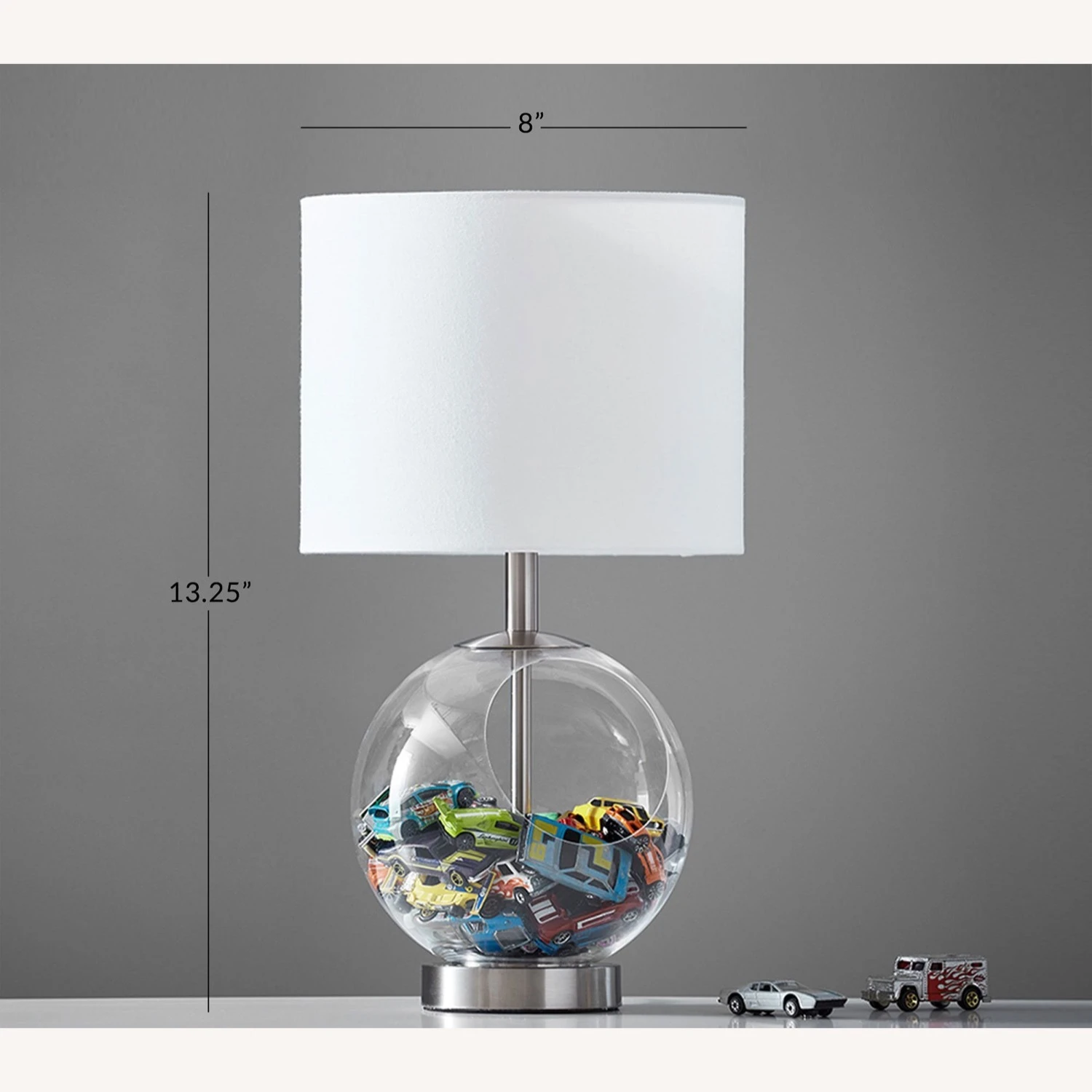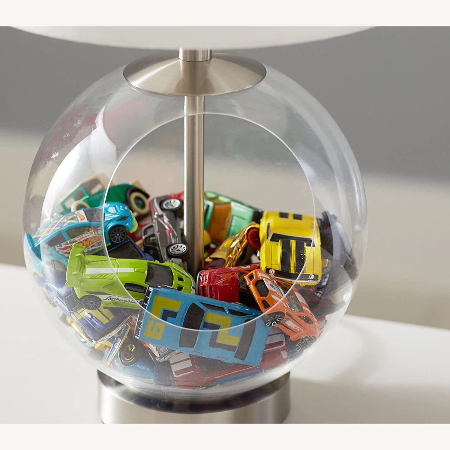 Seller’s Notes: Give your little collector a bright spot for displaying treasures. The clear acrylic globe features a wide circular opening and a stable base for safe storage. A satin nickel rod through the center conceals the cord, and the white linen drum shade emits a soft glow.