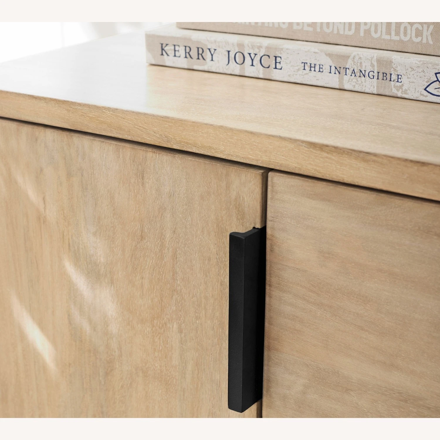 Dresser features 3 spacious drawers in center and 2 shelves behind doors on sides.