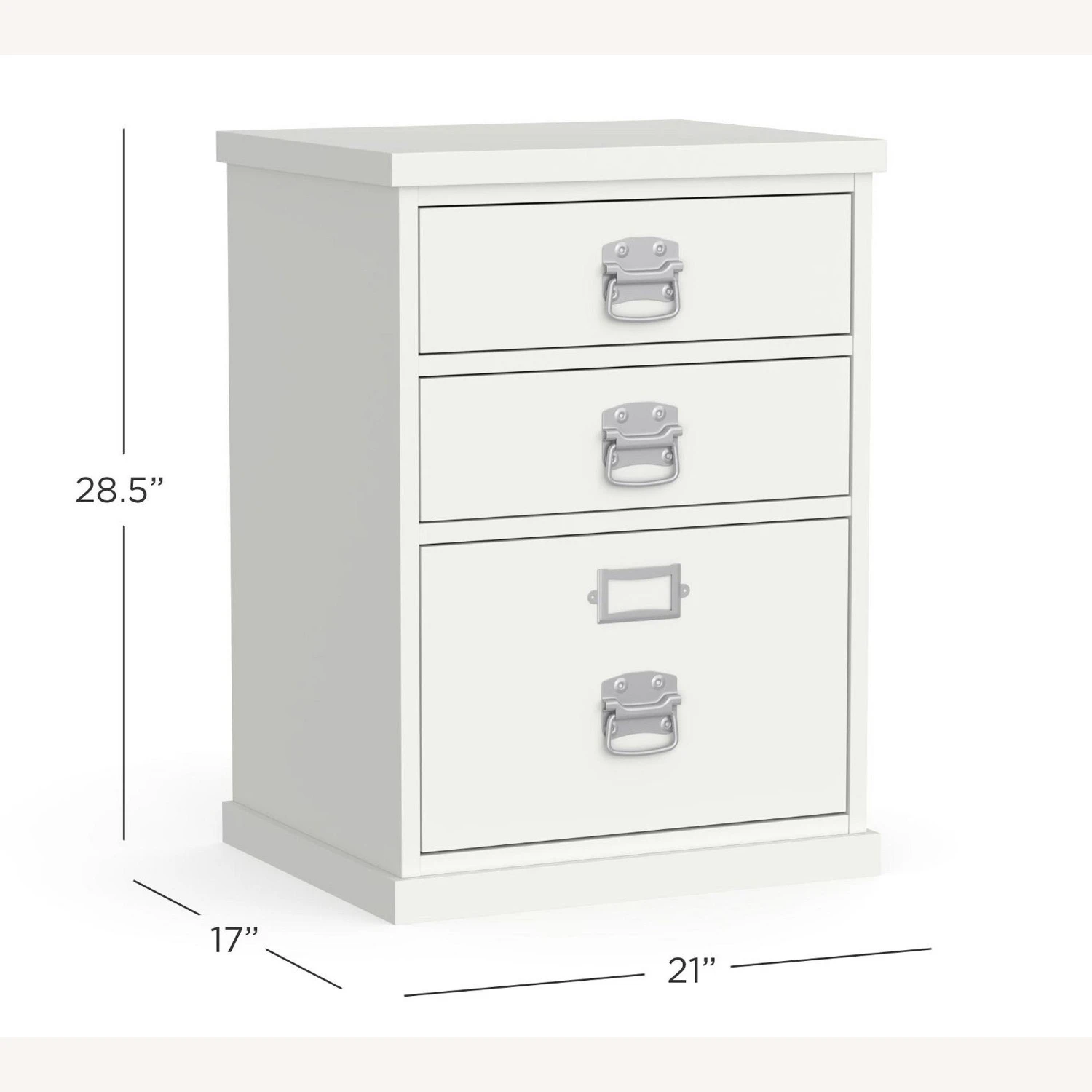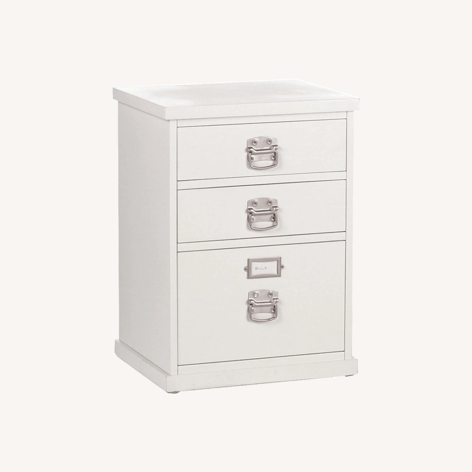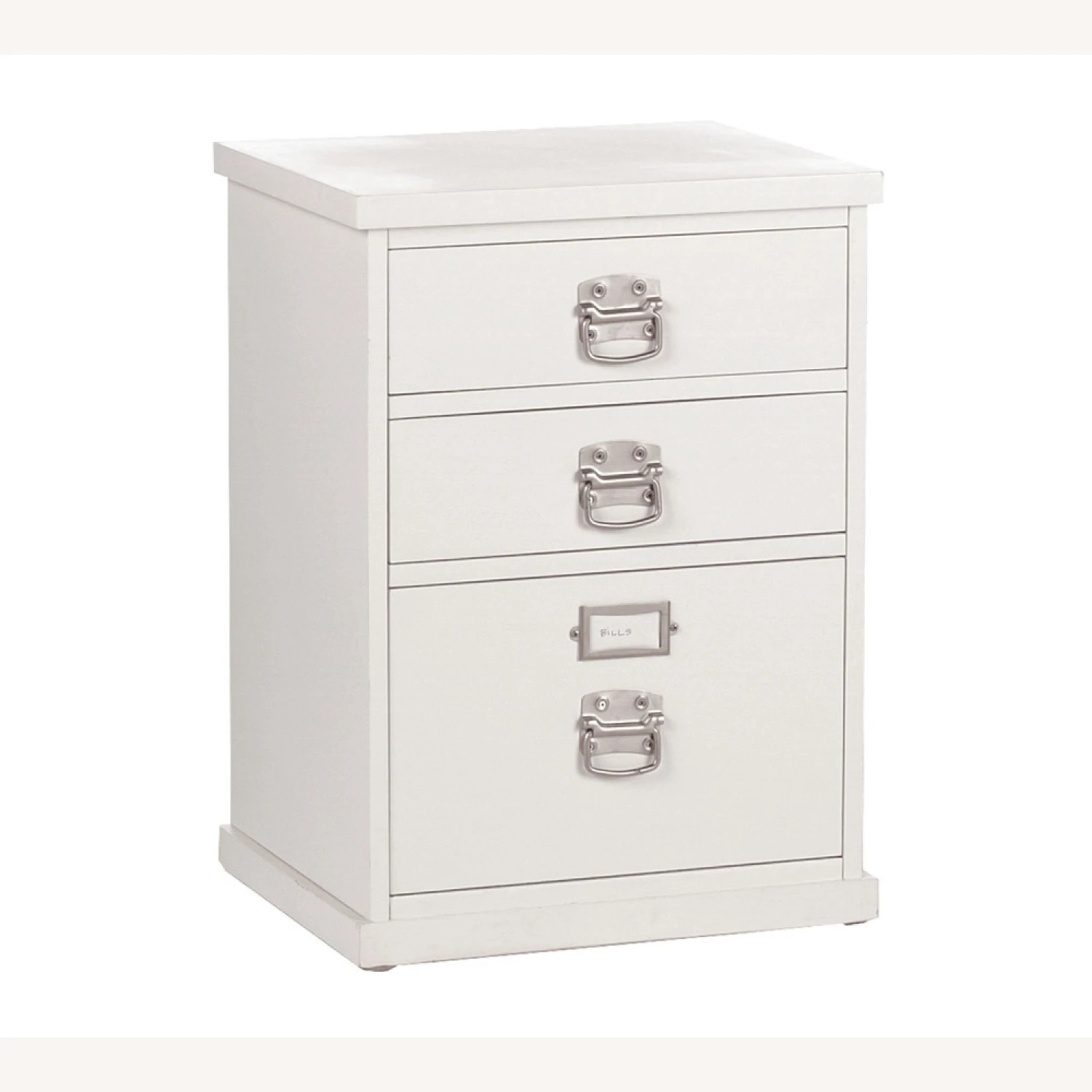 The 3-drawer cabinet features one file drawer and two smaller drawers for supplies.