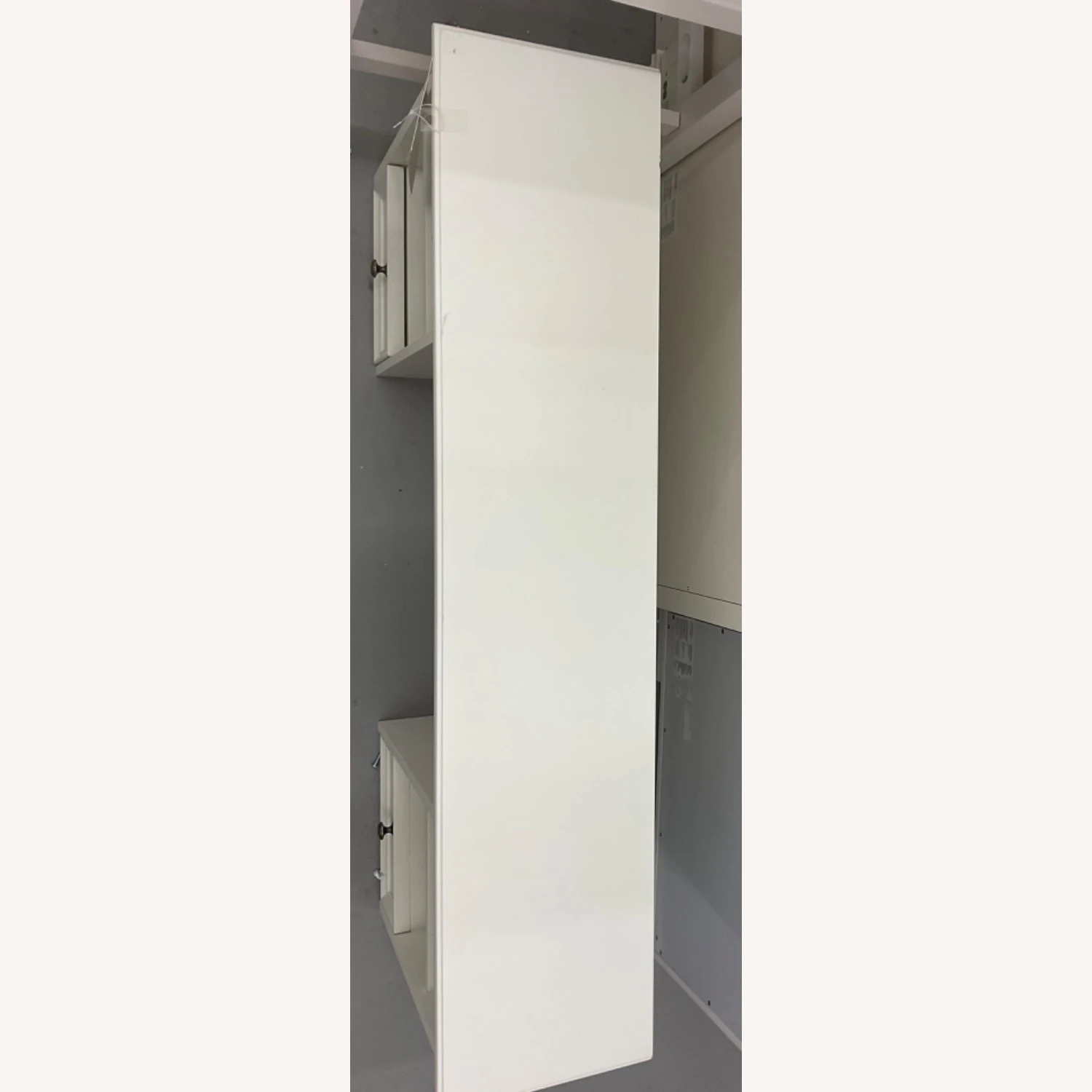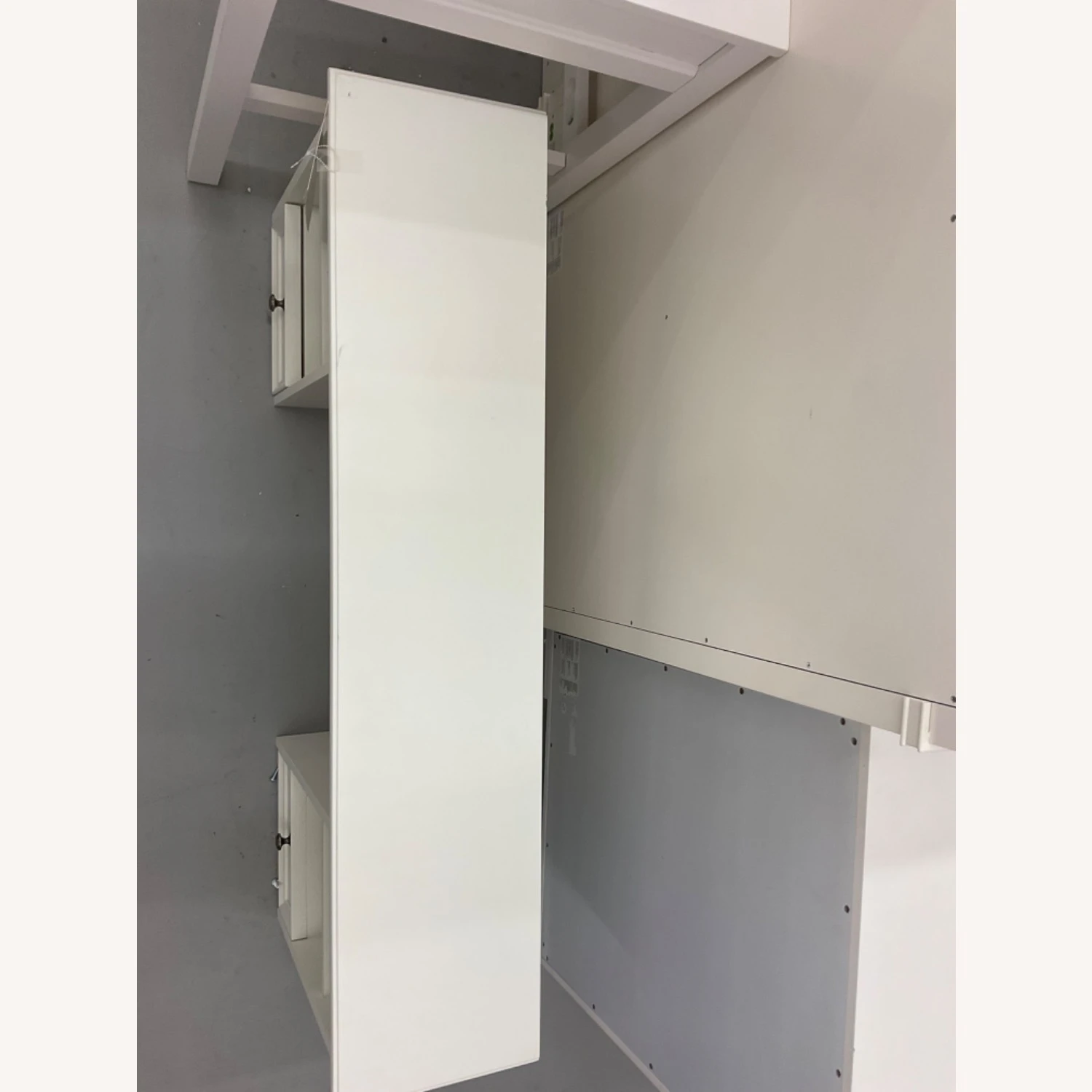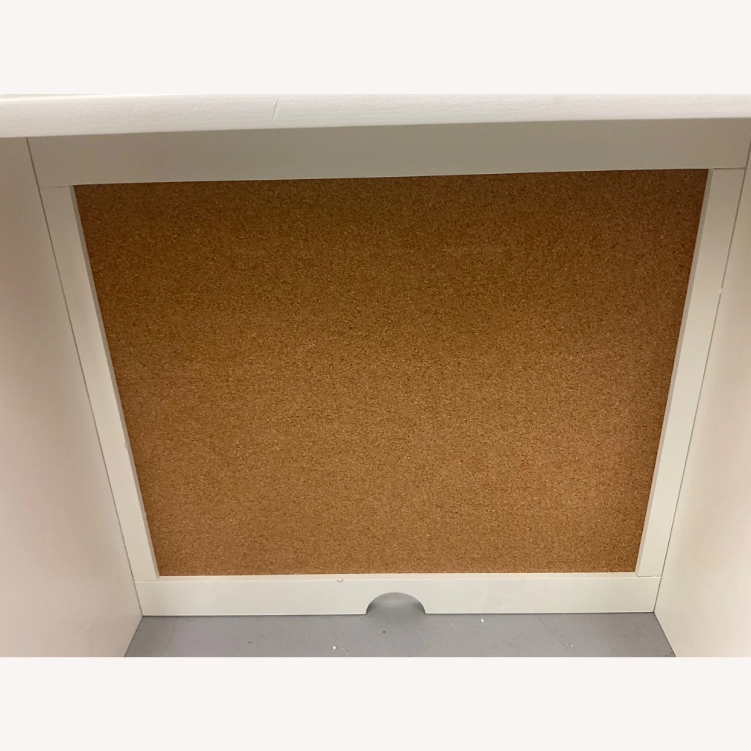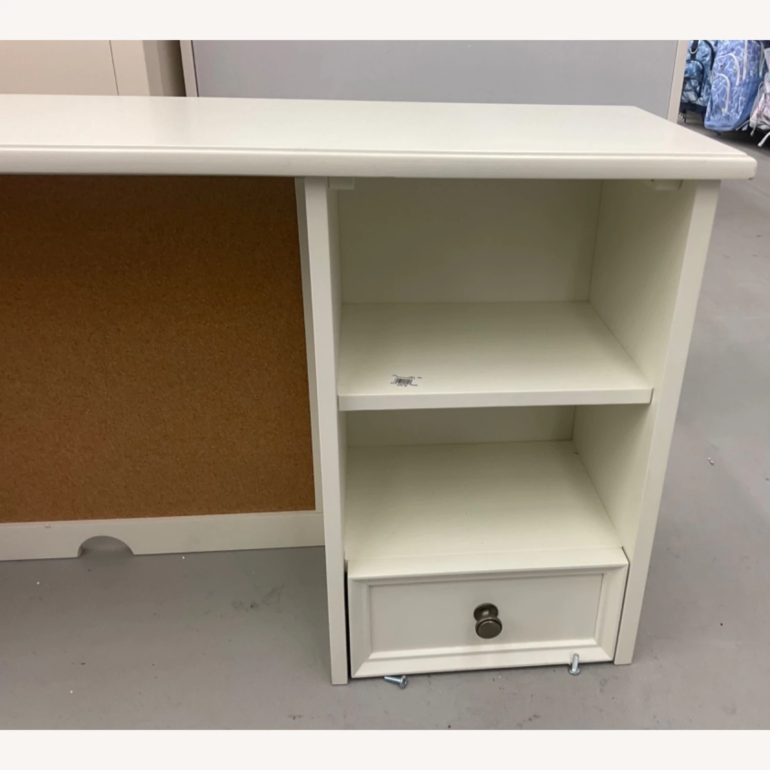 Hutch equipped with four storage cubbies, two drawers, corkboard back panel and a cutout for routing cords.