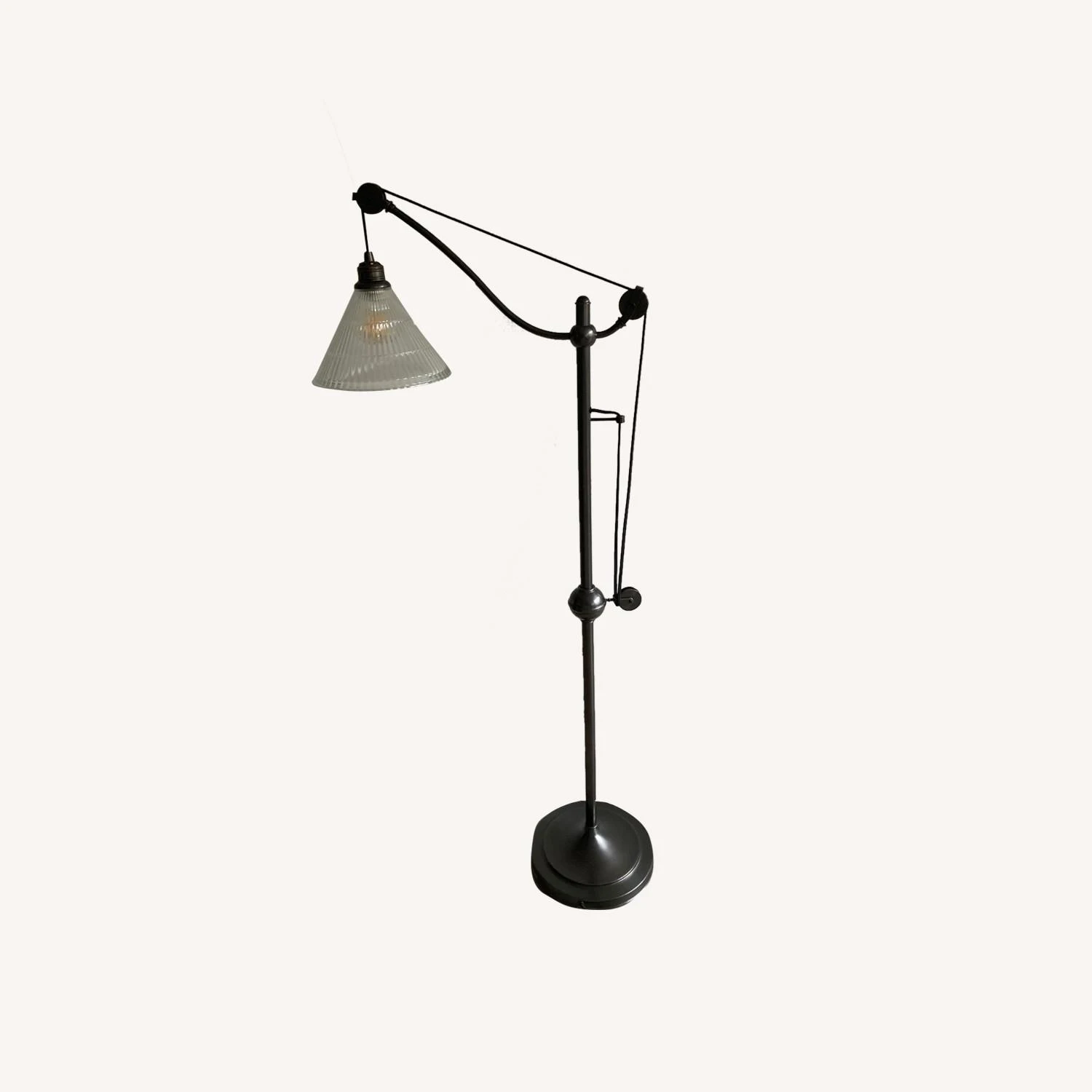 Designed after a found antique, the Bodhi Collection is a whimsical take on task lighting. The industrial-inspired iron base has a bronze finish, and a pulley system on this floor lamp allows it to adjust smoothly. Fitted with a thick ribbed-glass shade, it softly diffuses light. Crafted of iron. Clear glass shade. Finished in plated bronze finish. Simple assembly. On/off switch; plug in. UL-listed. Imported.