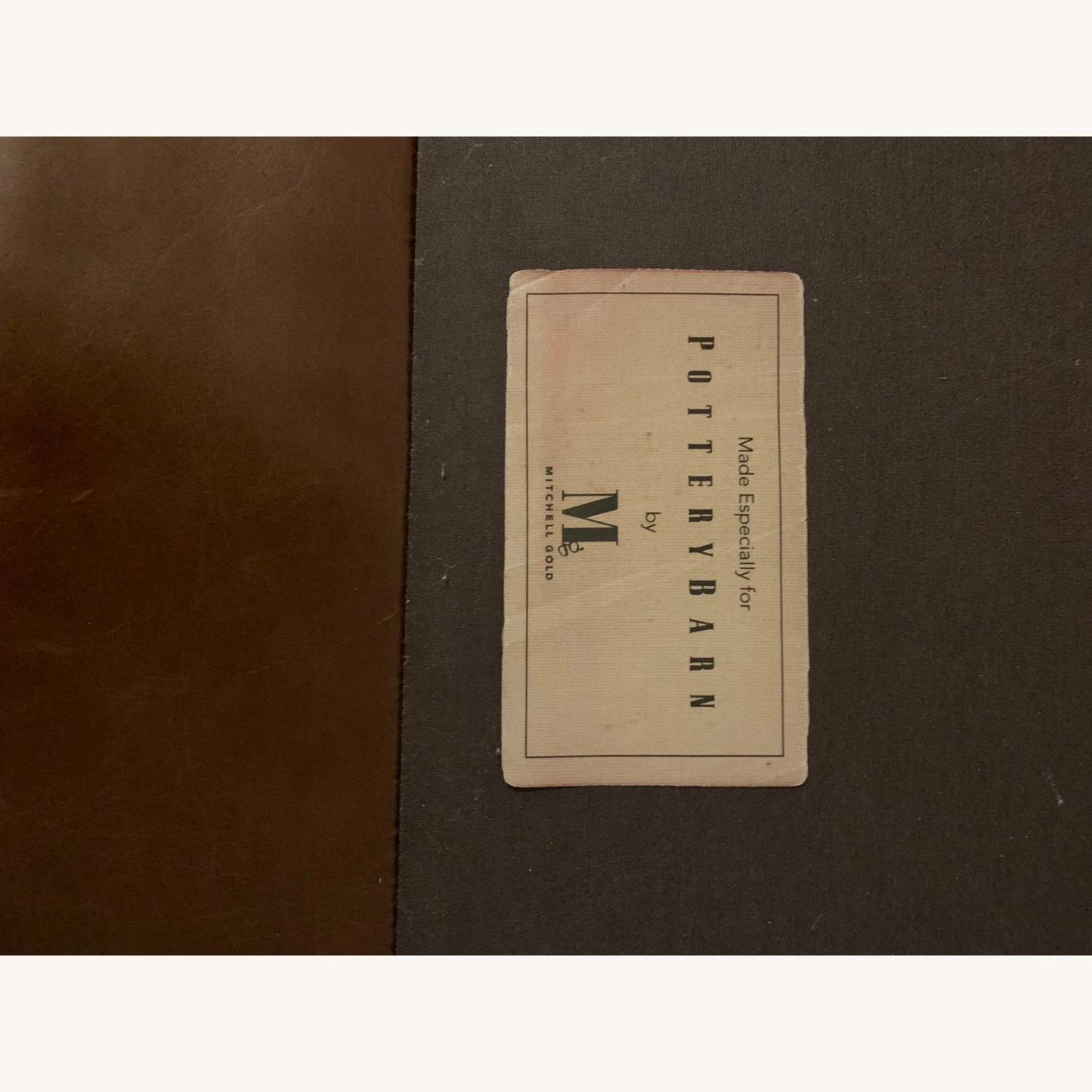 Seller’s Notes: Cognac color, Pottery Barn by Mitchell & Gold full top-grain analine-dyed leather sofa, natural shadings and markings, the cushions have natural wear, no tears or cuts. The frame is hard-wood, kiln-dried for durability over a long lifetime. The sofa has an angled back and streamlined curves. The leather panels emphasize the well-padded arms, and the high back and deep seat.