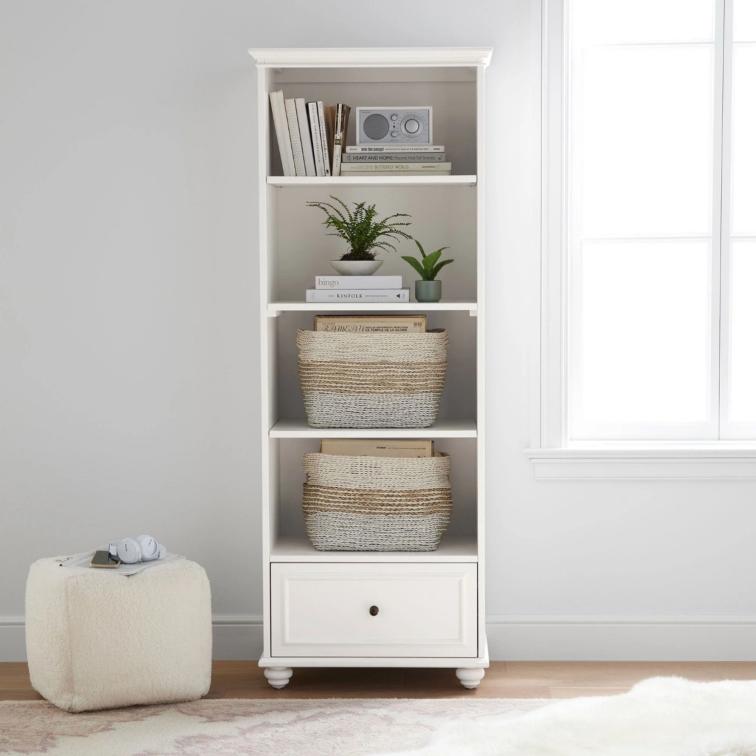 Bookcase features 1 drawer, 2 fixed shelves and 2 adjustable shelves for ample storage to be used with our bins and baskets.