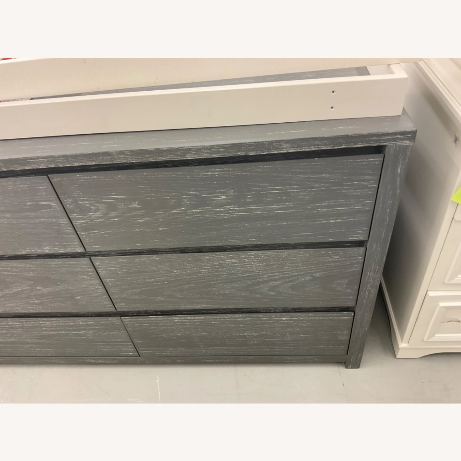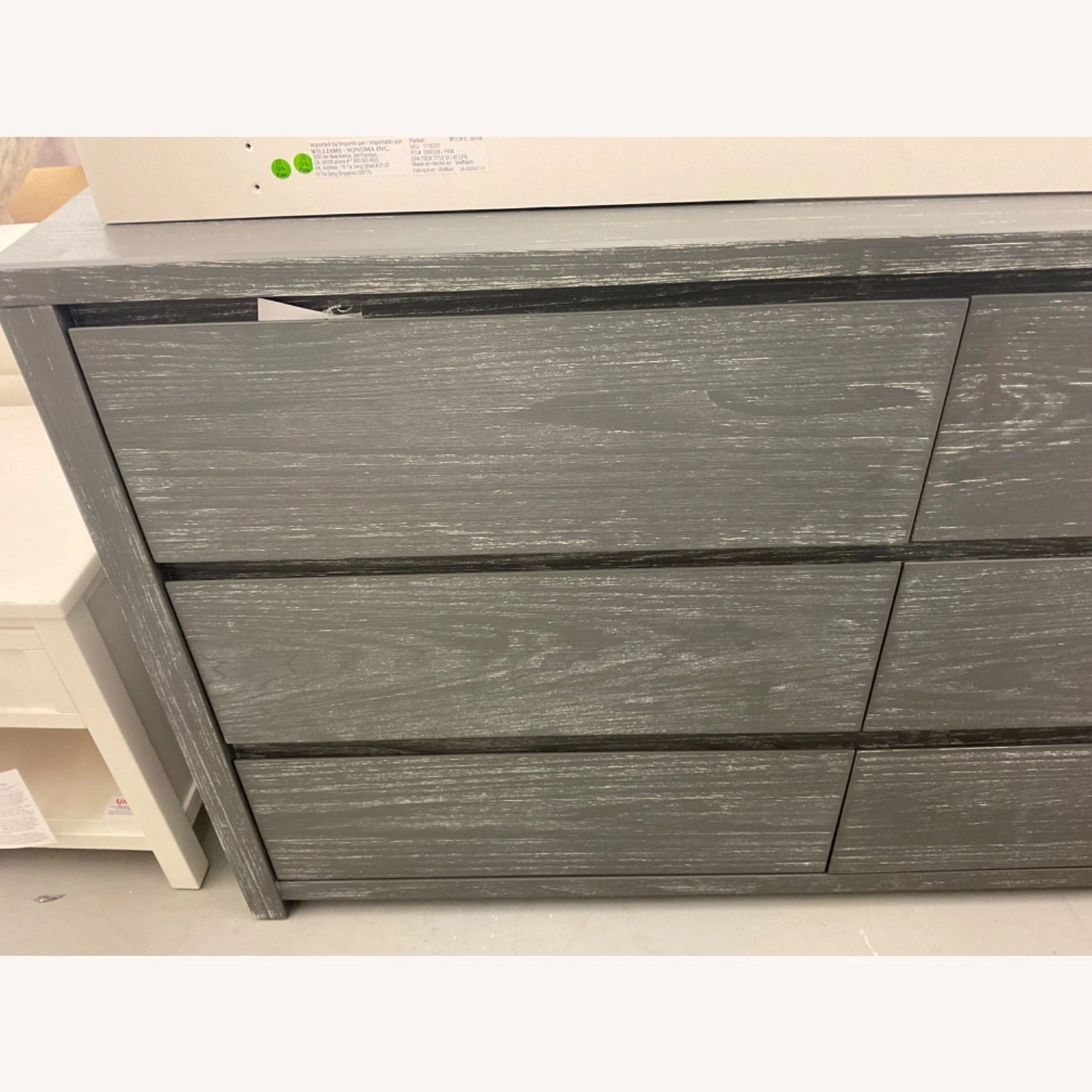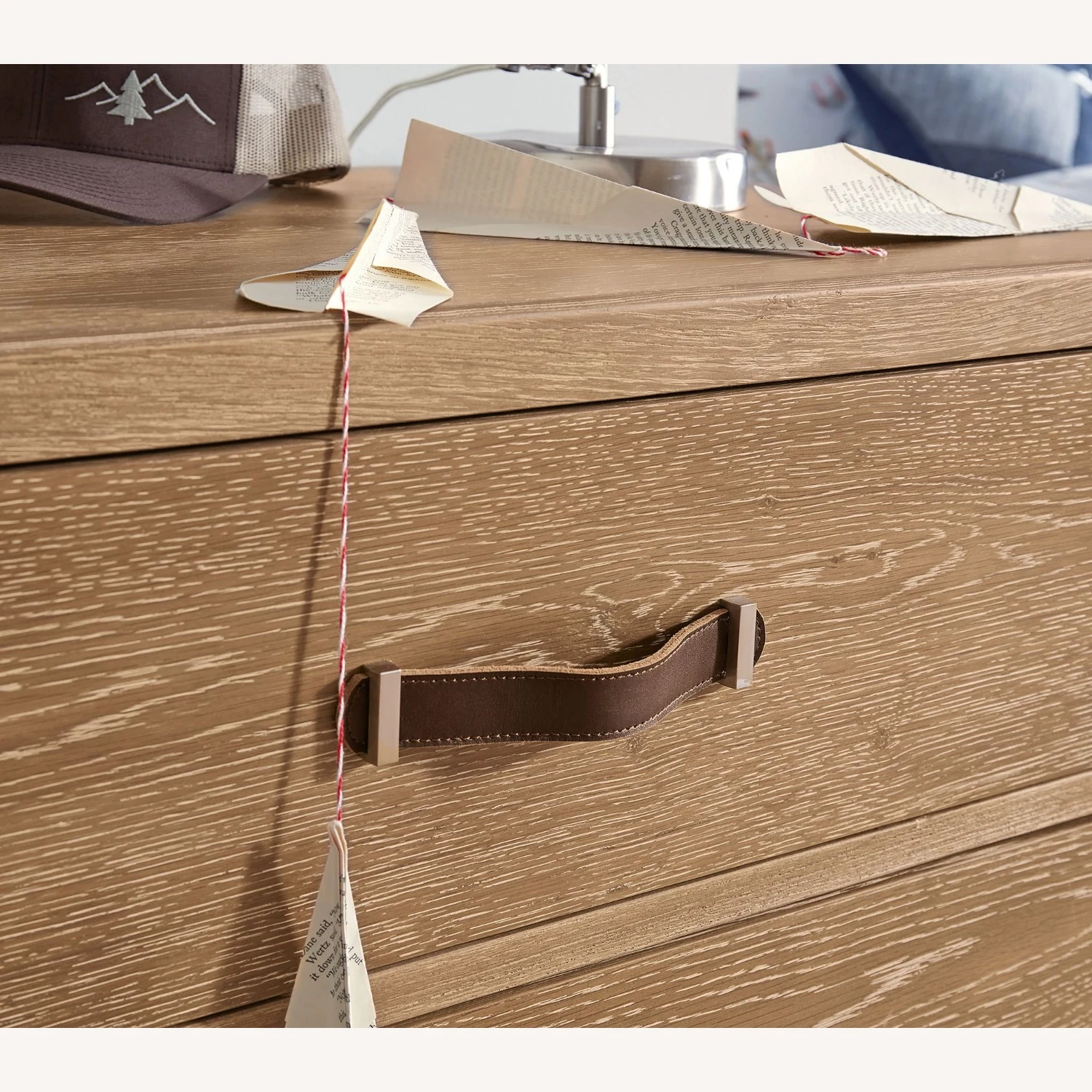 The leather drawer pulls on the Smoked Grey finish are a rich brown, Montauk White drawer pulls have a natural leather color.