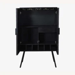 Features 4 stemware racks at top, one drawer and 6 wine bottle holders and 3 storage shelves in the interior.