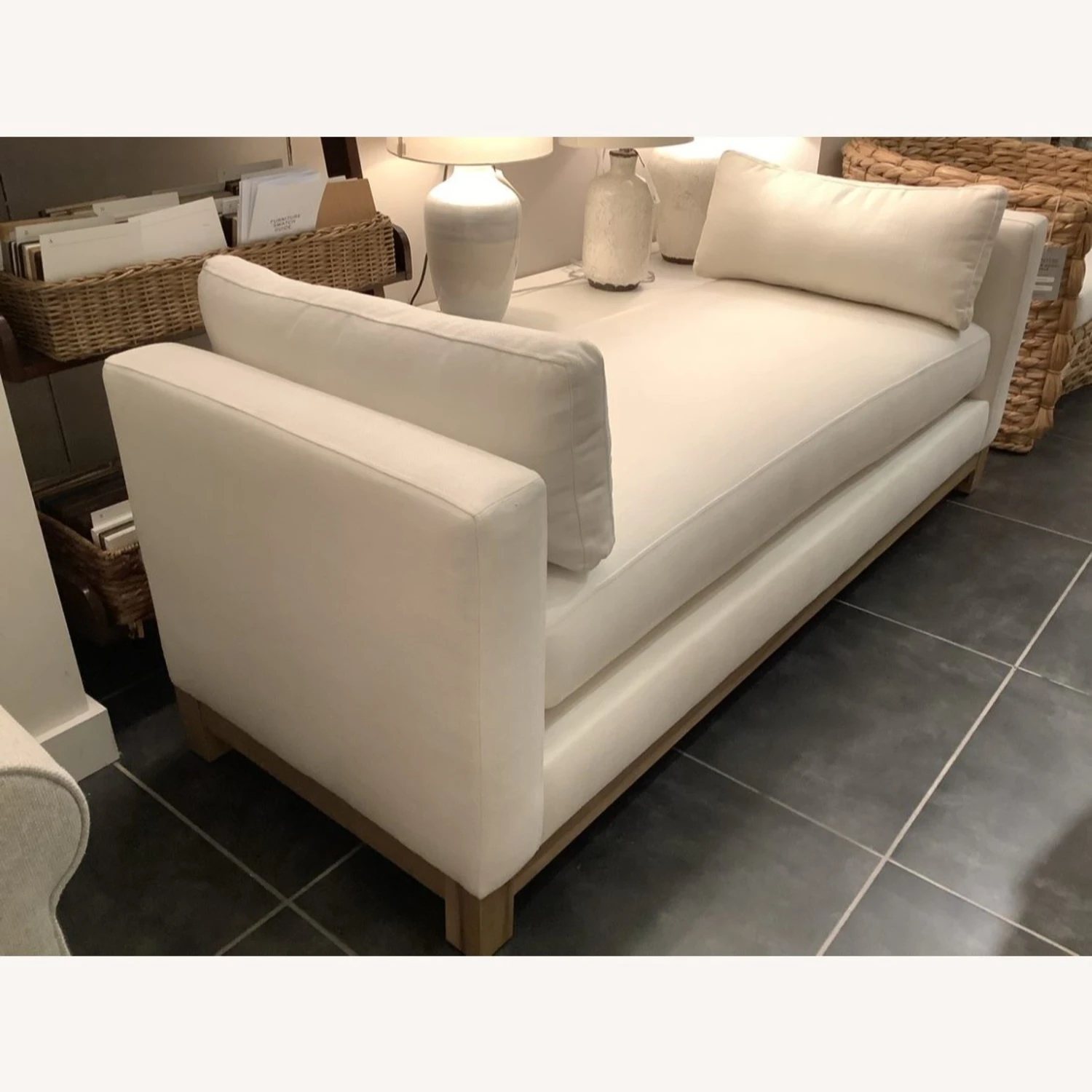 Polyester-wrapped cushions for a firmer feel.