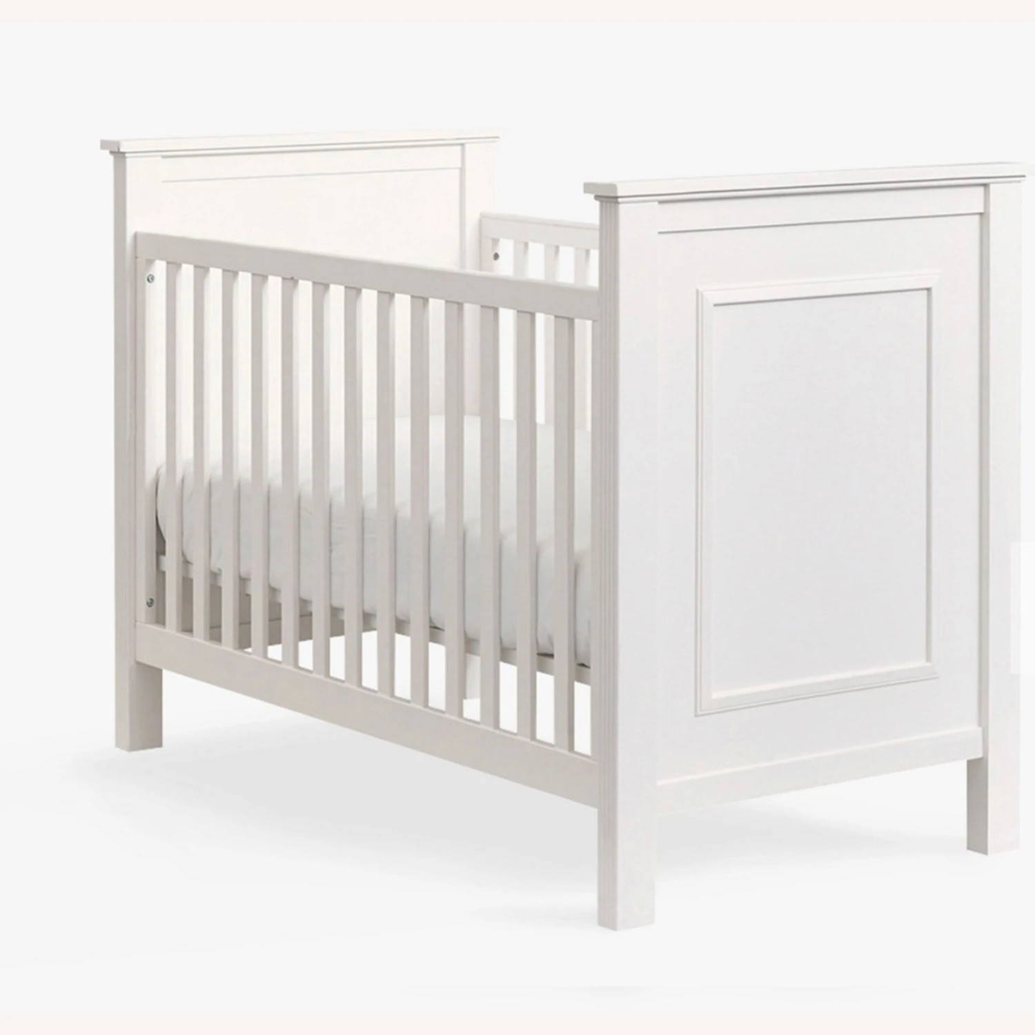 Seller’s Notes: This simple design has a timeless American appeal. Its picture frame–paneled ends and ribbon molding bring a clean, tailored look to the nursery.