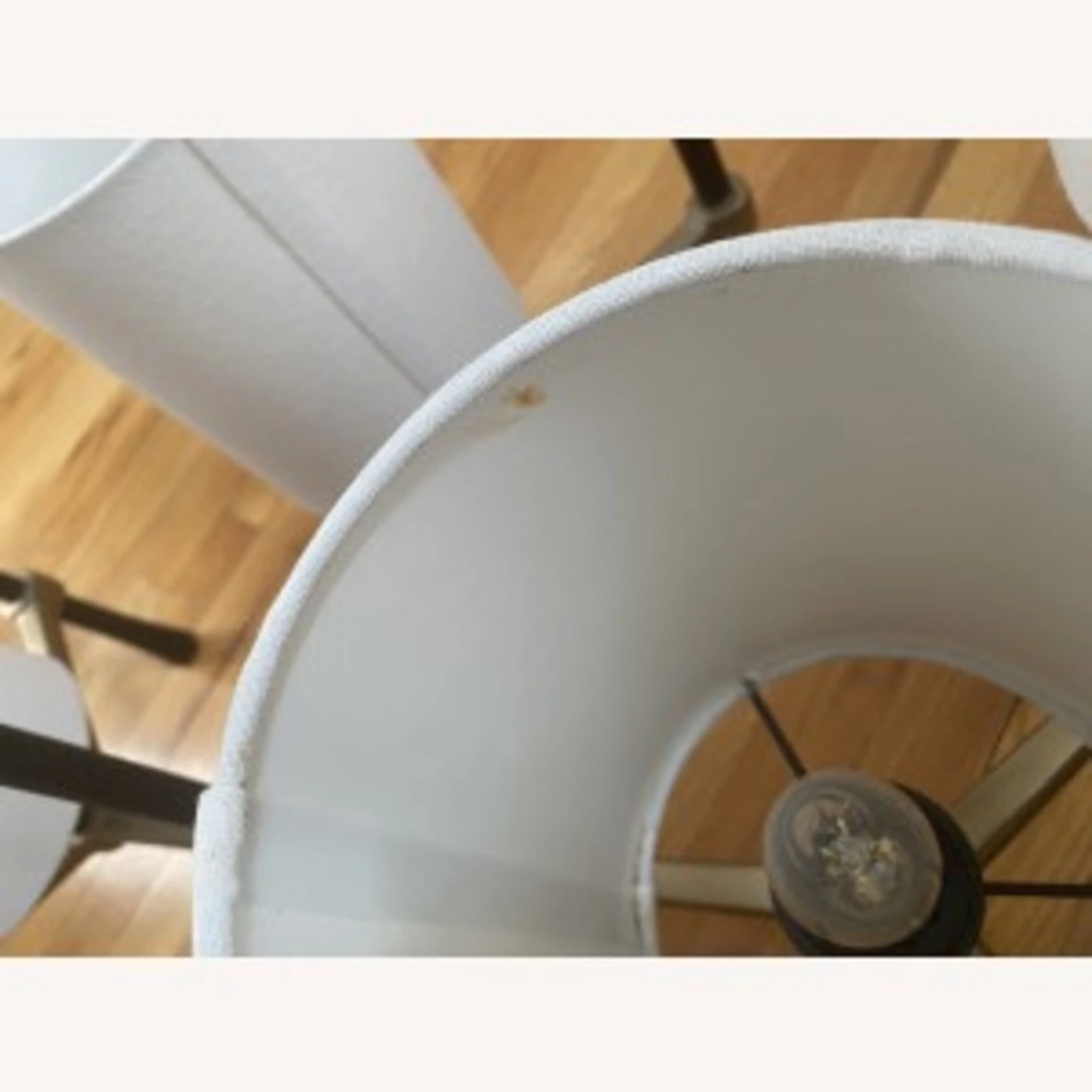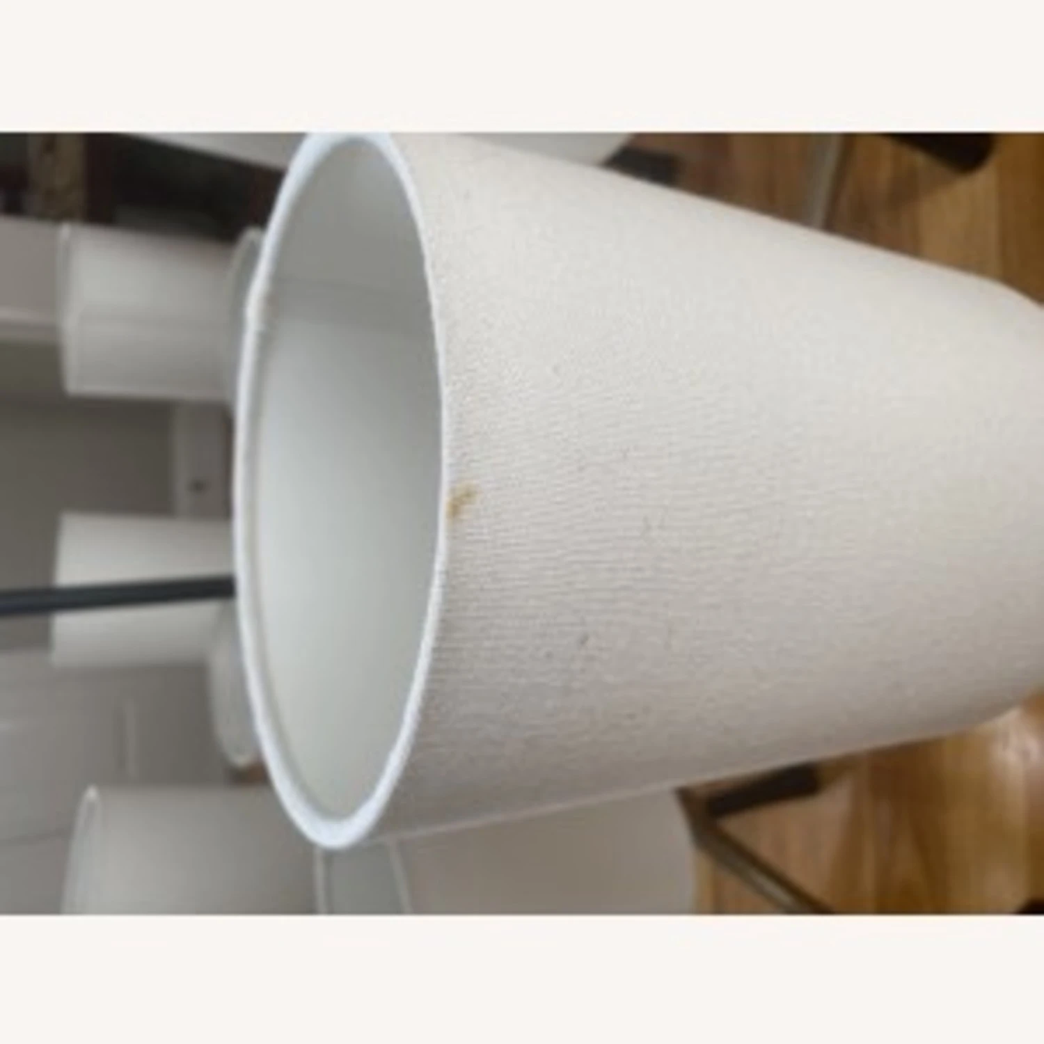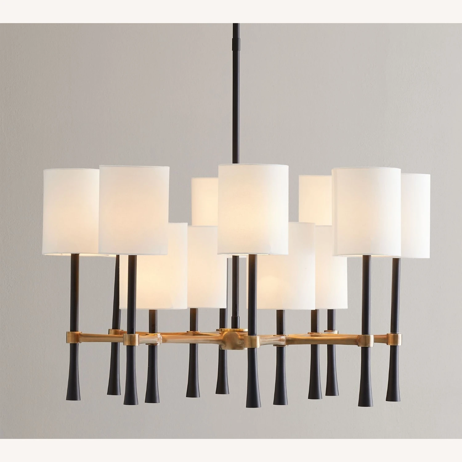 Seller’s Notes: Crafted from brass, steel, iron and aluminum with a burnished brass and bronze finish. Features a cotton linen shade with a styrene interior and an iron frame. Adjustable height. Light bulb(s) are not included. Accommodates twelve 25W, Type B Candelabra bulbs or LED equivalent. Imported. Due to it being a floor model its not brand new or in a box so there are minor imperfections such as scratches and stains. The photos will show a better representation.