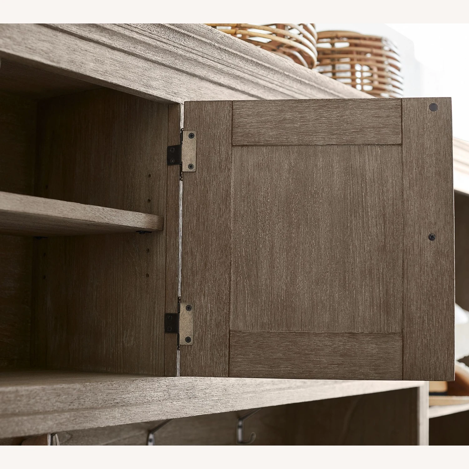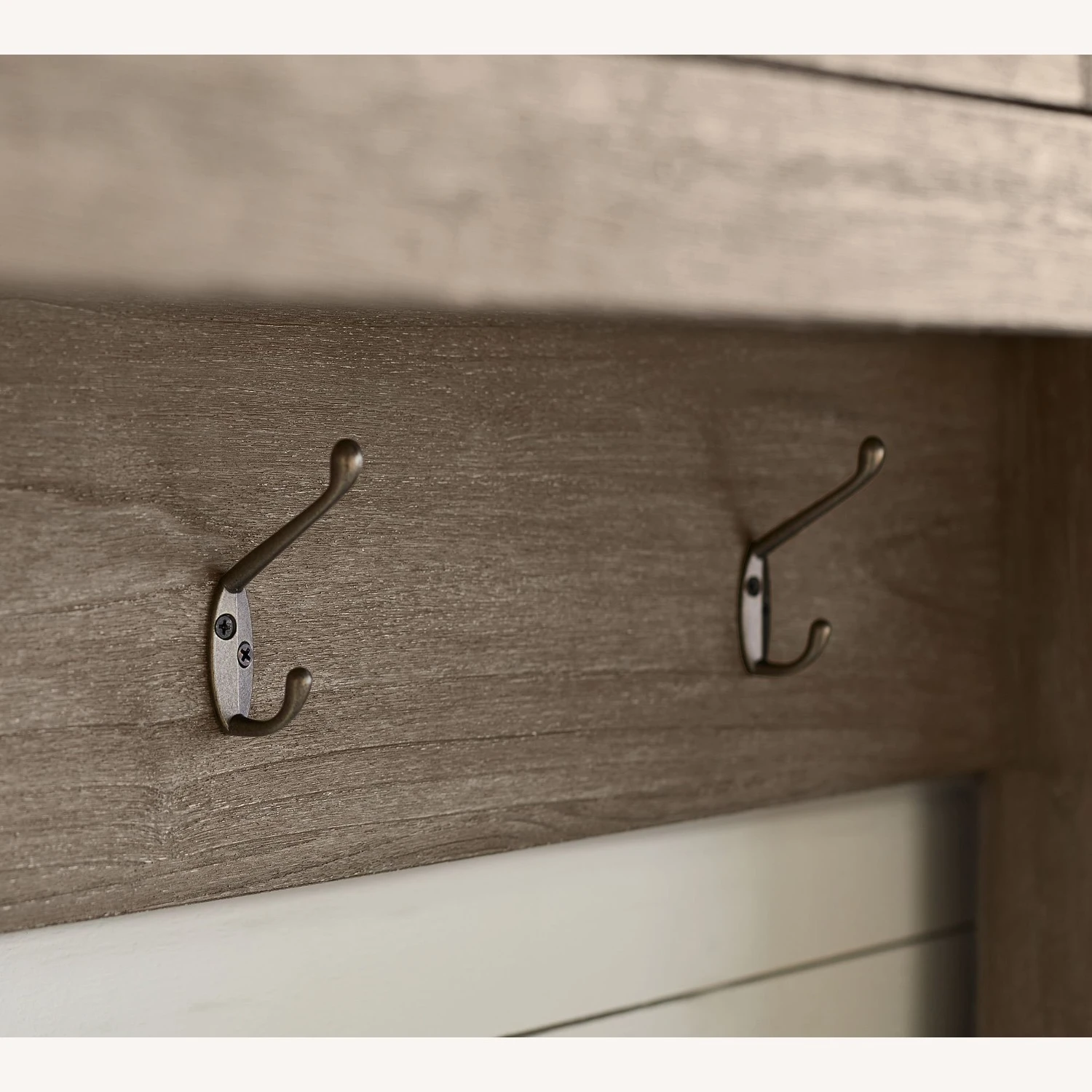Features 4 cabinet doors with 1 shelf behind doors and 5 hooks below cabinet.