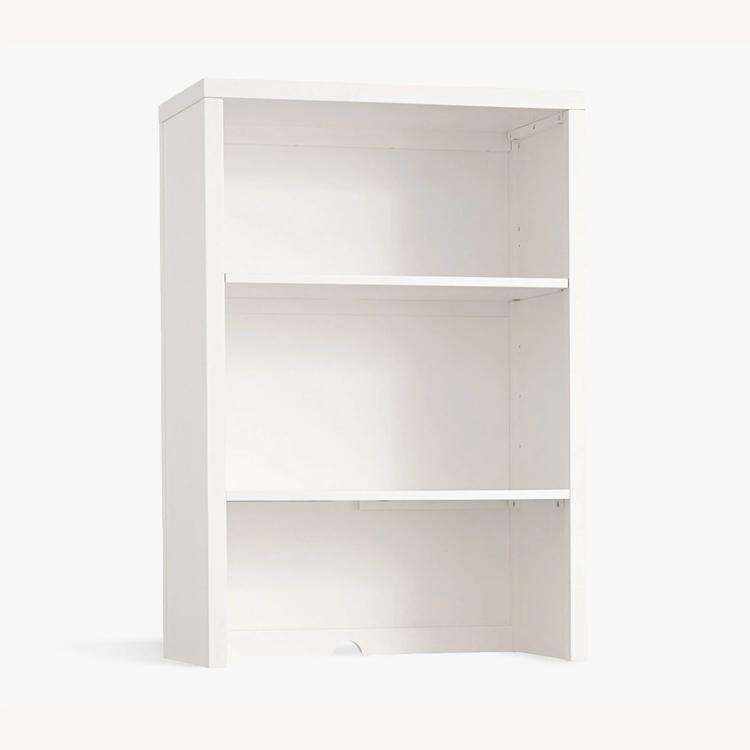 Bookcase Hutch features 2 shelves; top shelf can be adjusted, bottom shelf is fixed. Also designed with wire management cutouts for a small media station.