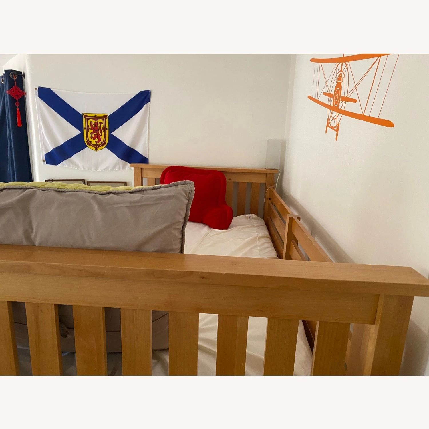Seller’s Notes: A fantastically solid bed and good-looking bed. Well-used and has some superficial wear and tear but completely structurally solid, with many years of use to go. Sat on top of a full bed as the upper bunk but is made to also be used. as a full twin stand-alone bed. Comes with guardrails that can be added, or not. Closest model now is PB Elliott Bed.